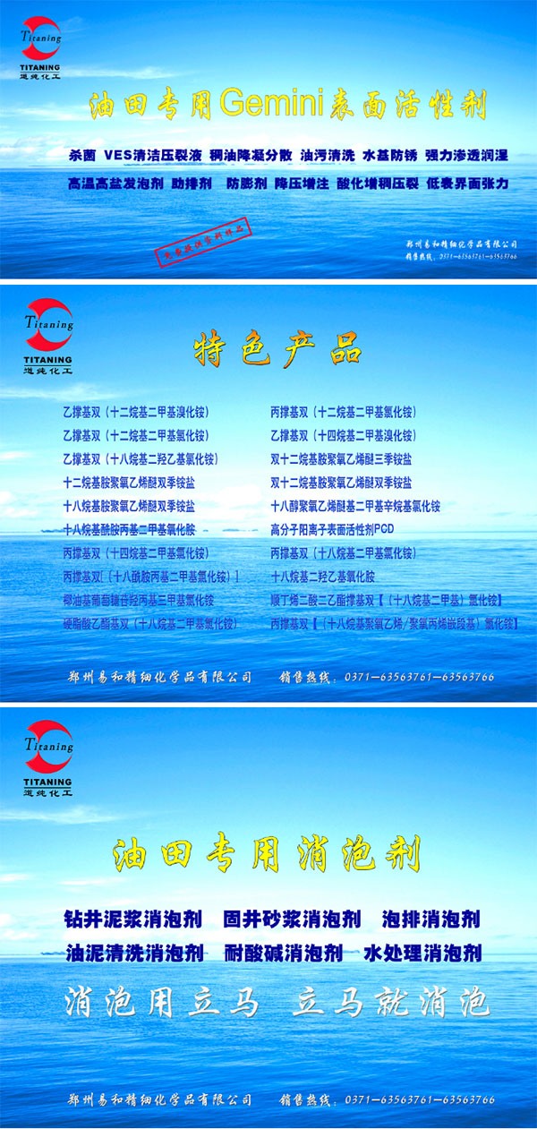 油基鉆井液用表面活性劑 主要成分是十八烷基乙氧雙季銨鹽,其HLB值適中,集乳化、分散、穩定功效于一體。適用于油基 鉆井液的乳化劑,根據所用水礦化度的不同,一般添加5%~15%。由該產品做出的鉆井液可耐200℃的高溫。